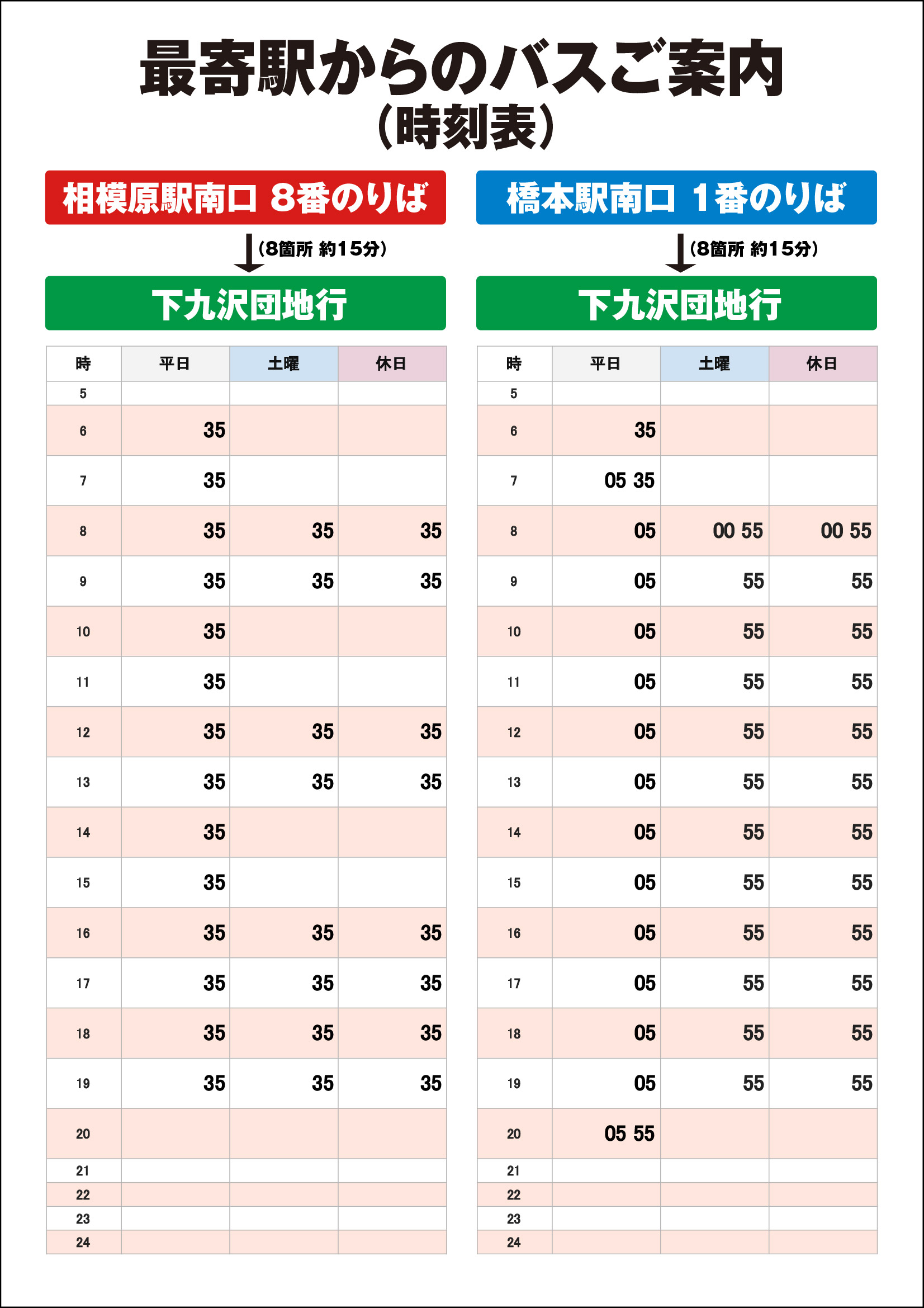 JR横浜線 相模原駅南口 バス8番乗り場 下九沢団地行→下九沢団地下降(相模原駅より15分 220円) 徒歩1分